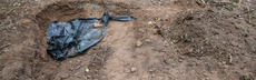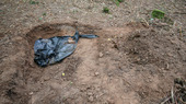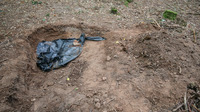 Mit weißen Anzügen und Mundschutz machen sich sechs Kriminaltechniker aus Pforzheim und Karlsruhe umgehend ans Werk, Spuren zu sichern. Zwei der Beamten sind mit Schaufeln dabei, den Körper auszugraben. Verwesungsgeruch liegt in der Luft.
